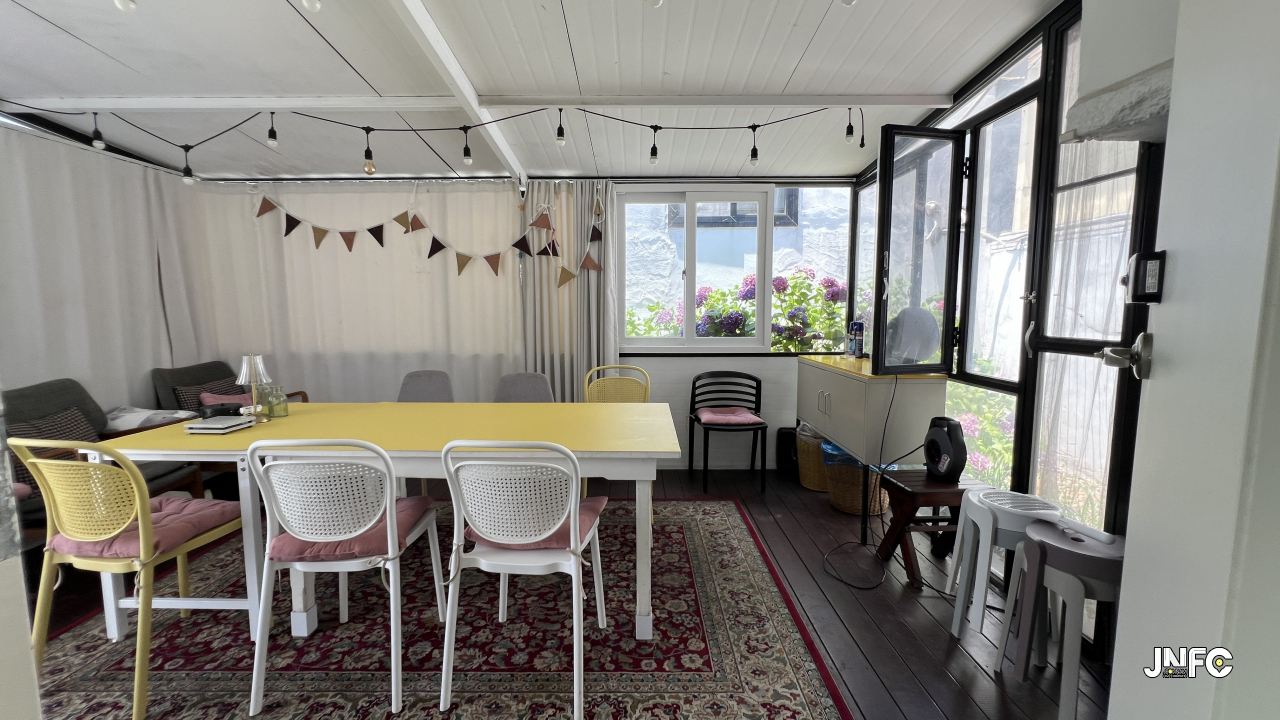 꽃이 심겨진 잔디밭 마당과 두채의 독립된 숙소공간 그리고 공용주방이 딸린 감성숙소이다.