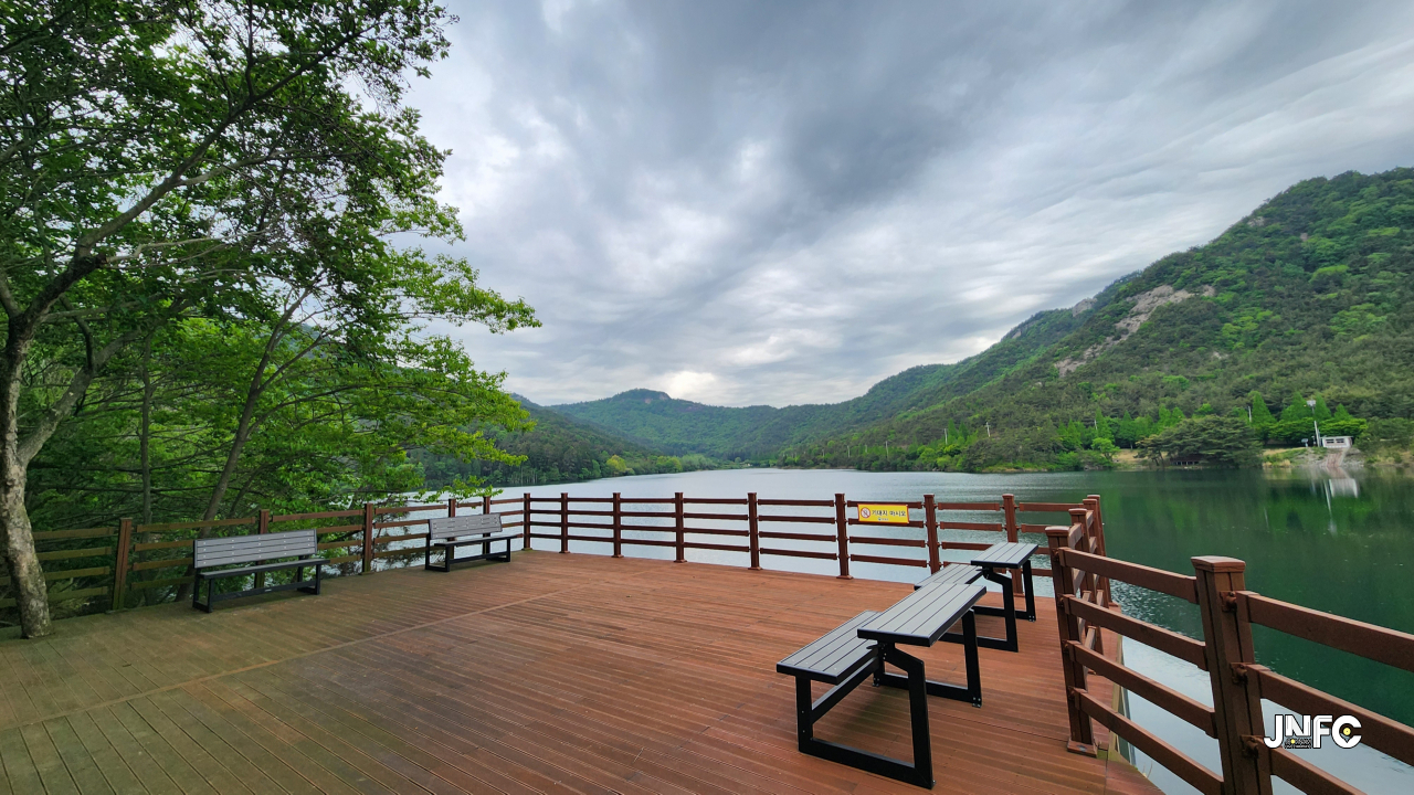 저수지와 주변 데크산책로, 주차장이 있다.