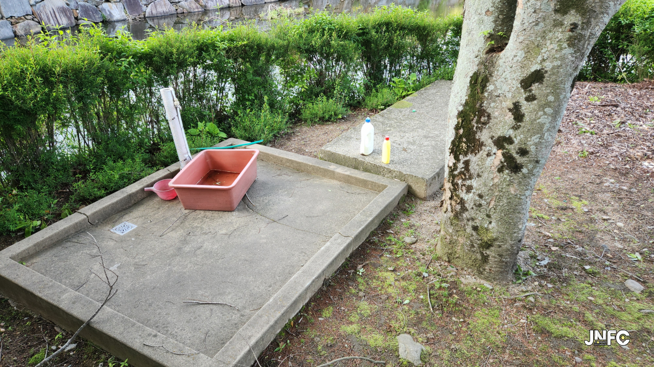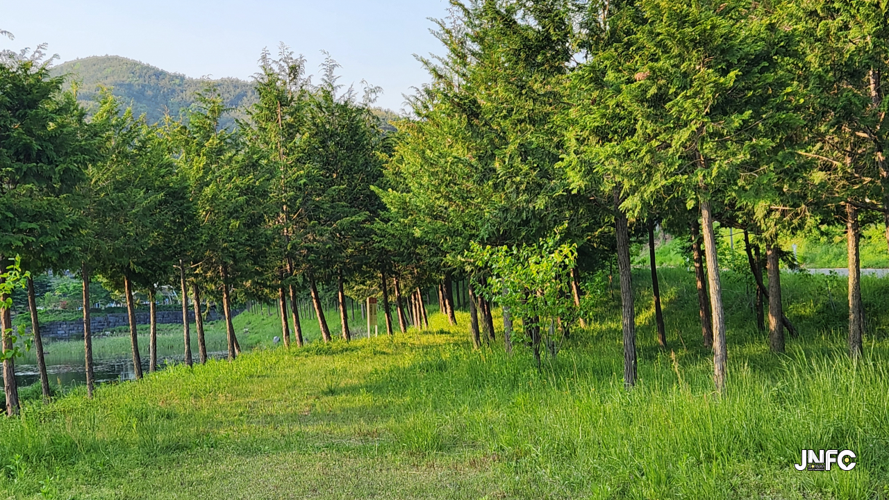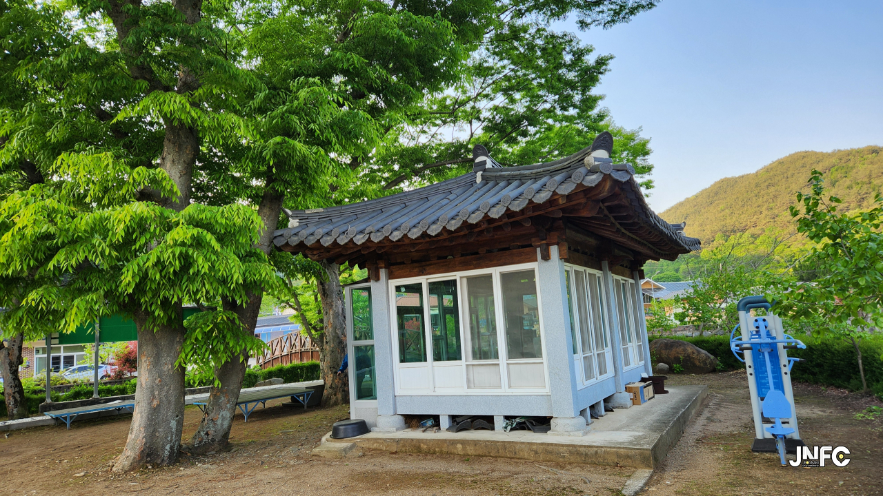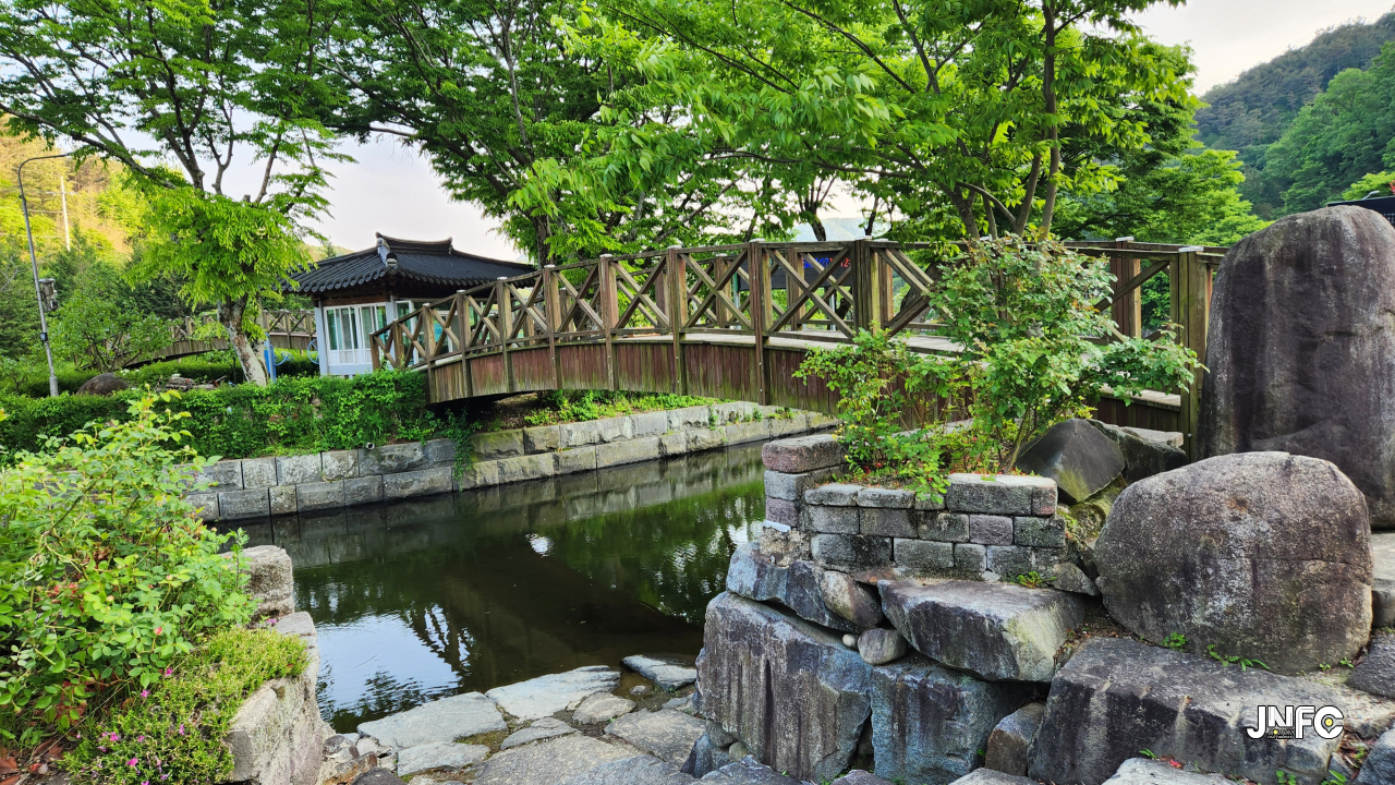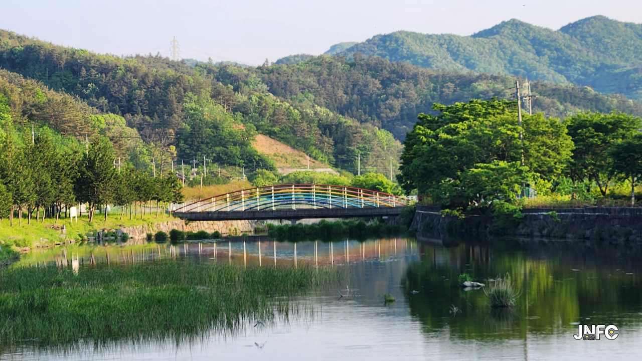 하천과, 하천 건너 작은 빨래터와 잔디마당, 작은무대, 무지개다리와 넓은 주차장이 있다.