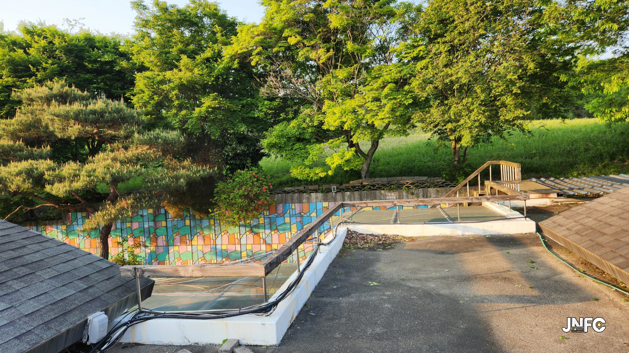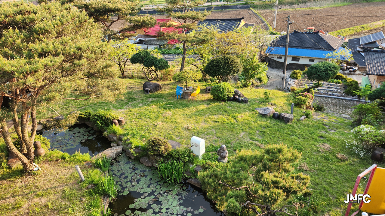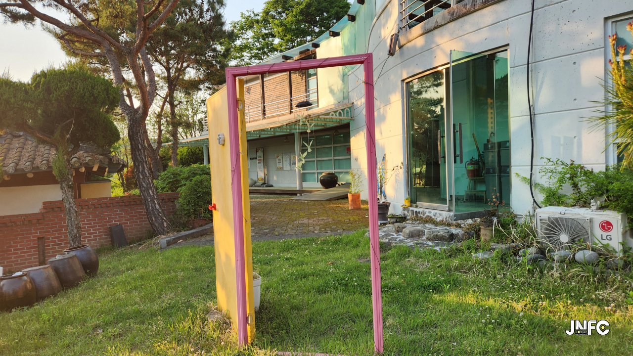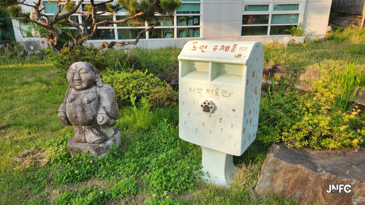 시골 미술관에 위치한 1,2층 전시관, 정원이 있고 2층 사택이 위치하고 있다.
